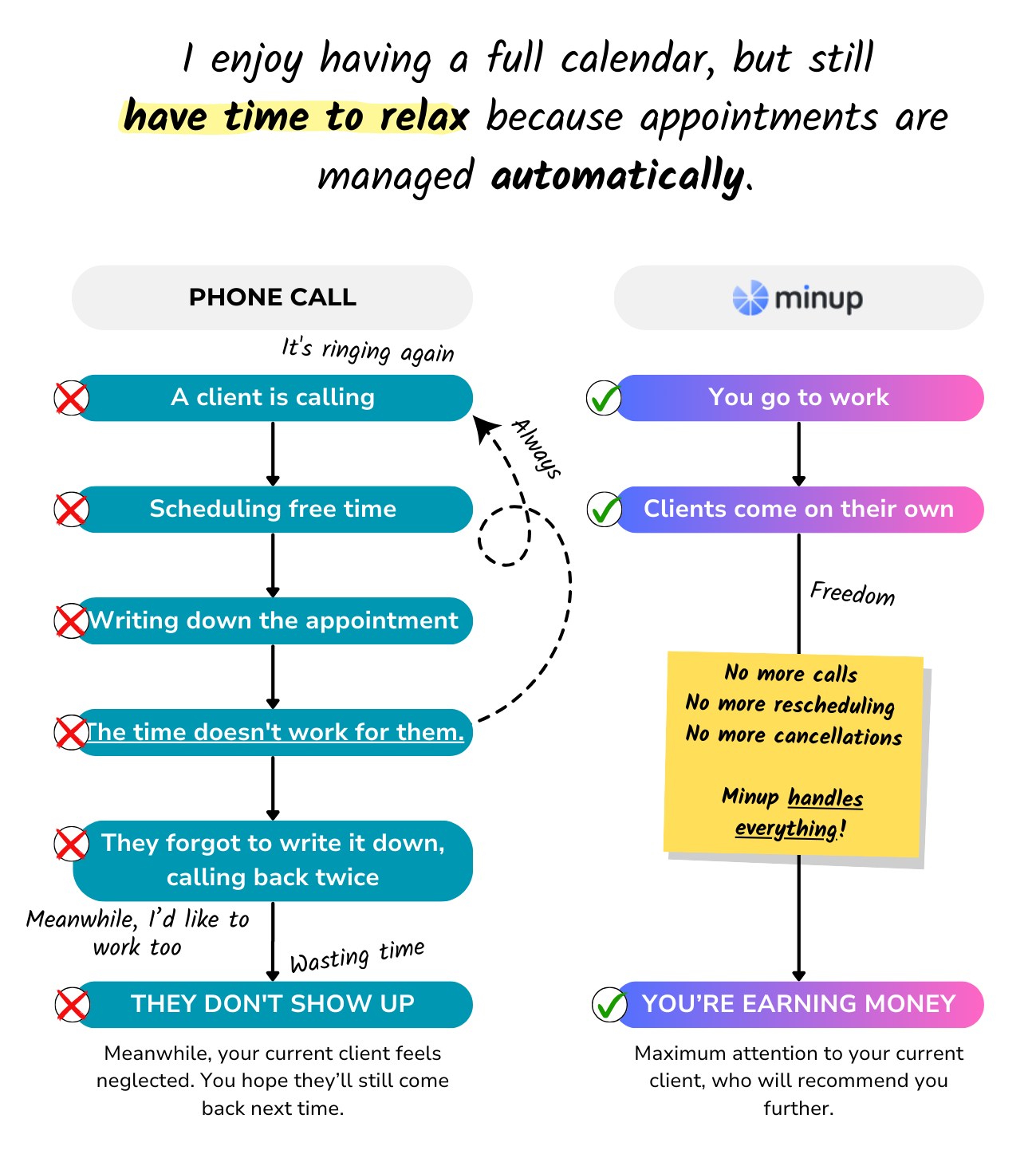 As a hand and foot care professional, I find Minup very helpful. My guests can see when I'm available and when they can book appointments. And with manual booking confirmation, I can make sure to only take serious guests. Plus, it syncs with my Google calendar.